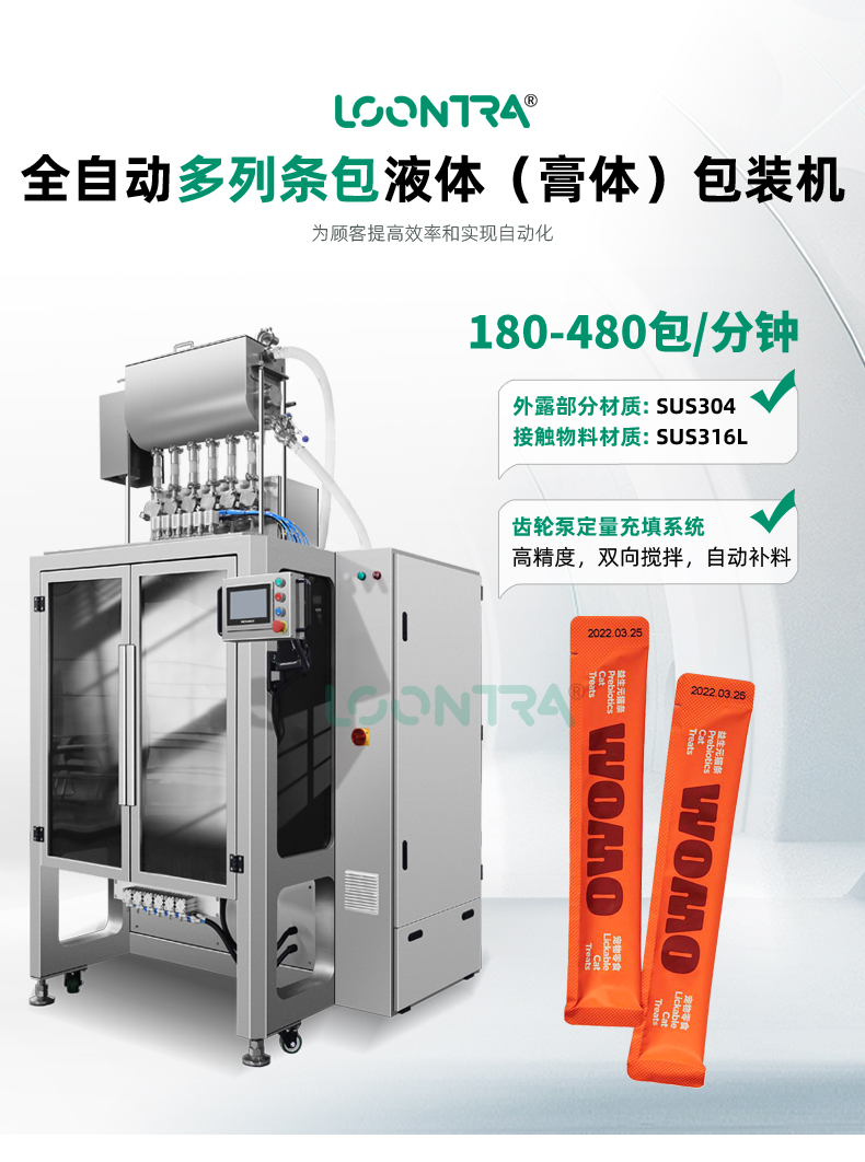 隆川多列包装机在食品、医药、化妆品等行业均有广泛的应用,客户可以根据自己的生产需要选择不同类的多列包装机,分别能对液体、粉末、颗粒形态的物品进行多列包装。【接受客户非标定制,支持多项功能配置选择。】